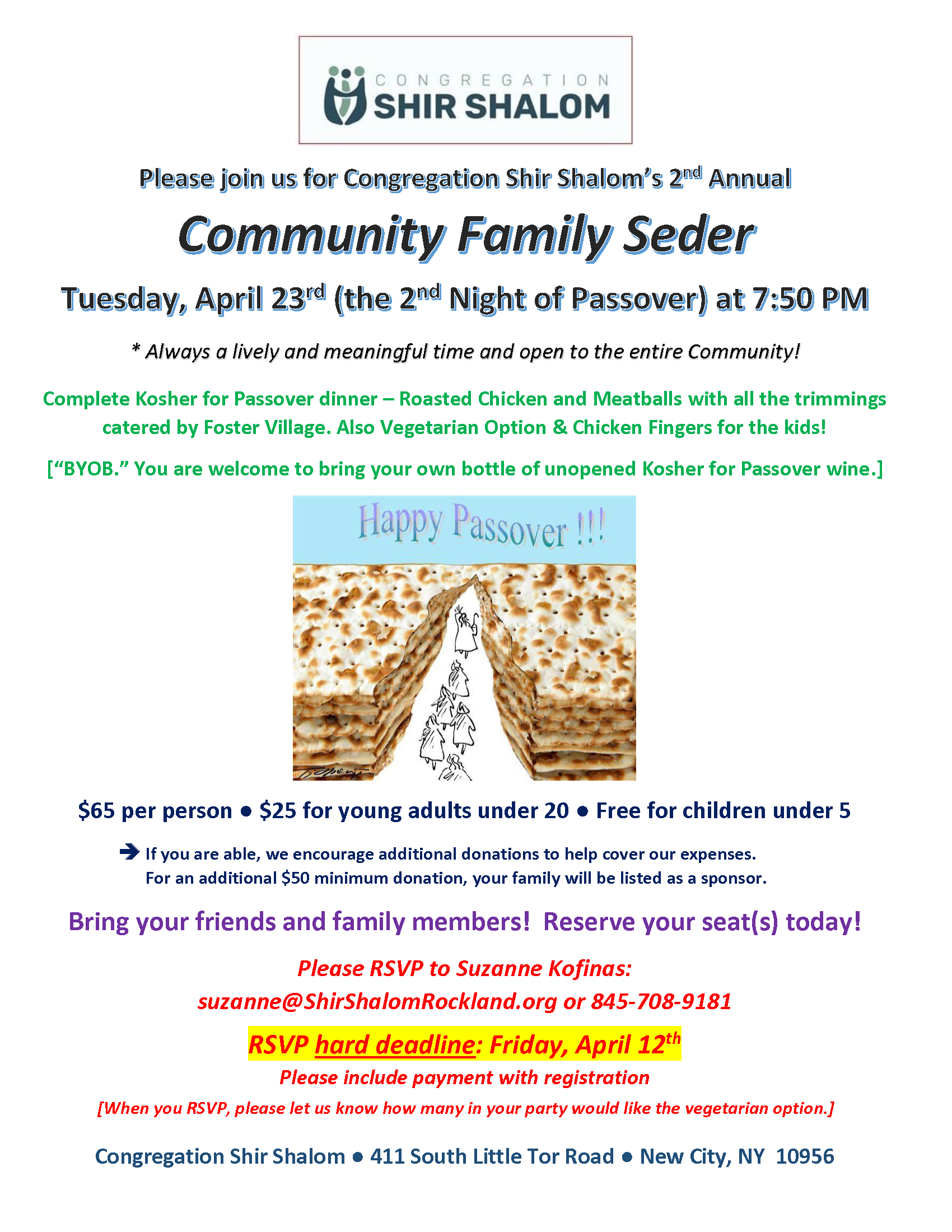 Please join us for Congregation Shir Shalom’s 2nd Annual Community Family Seder